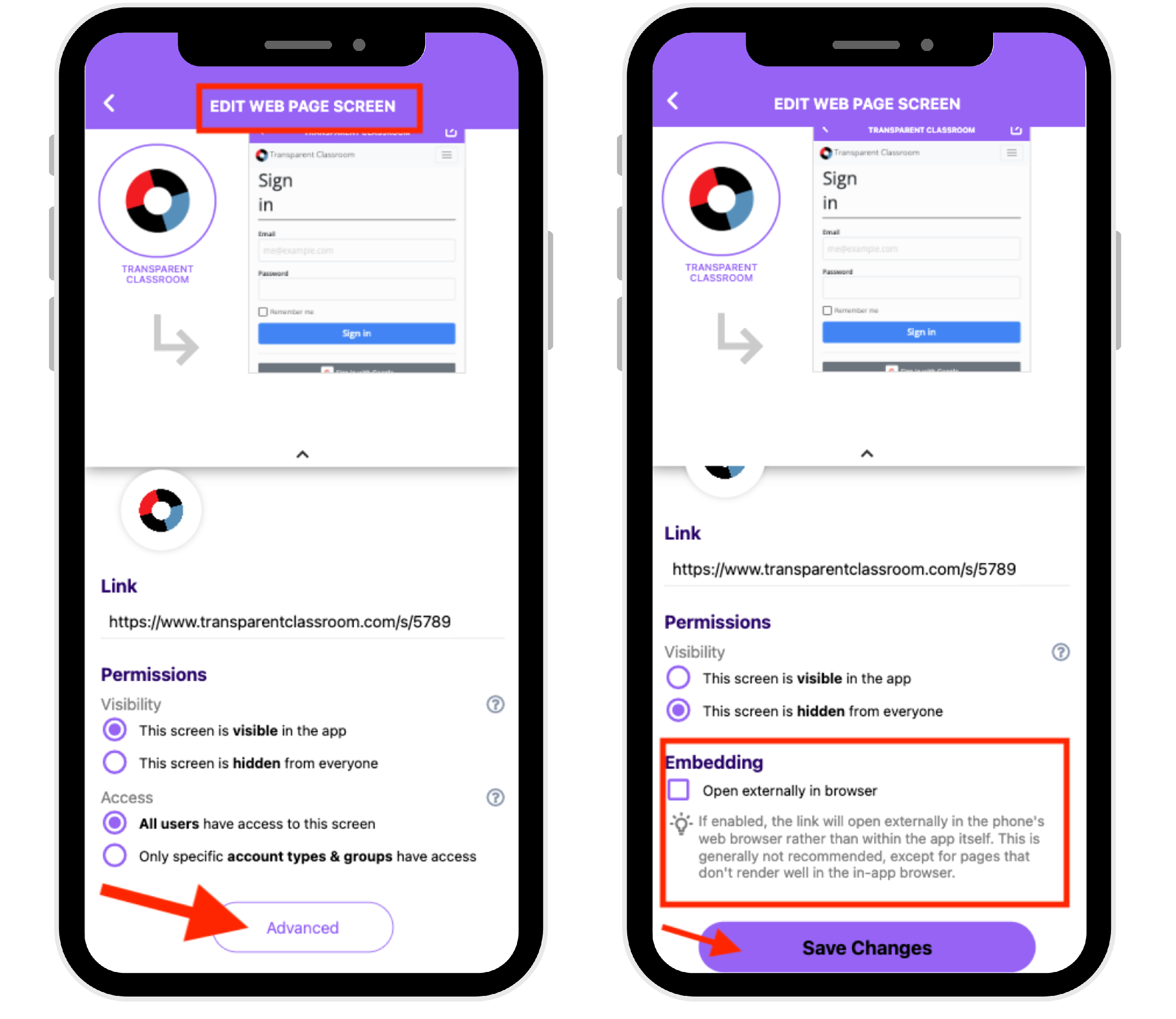 When adding links (like sign-up forms, donation pages, or external websites) to your app, you may see a checkbox labeled “Open externally in browser” under the Embedding section of a Web Page screen.
