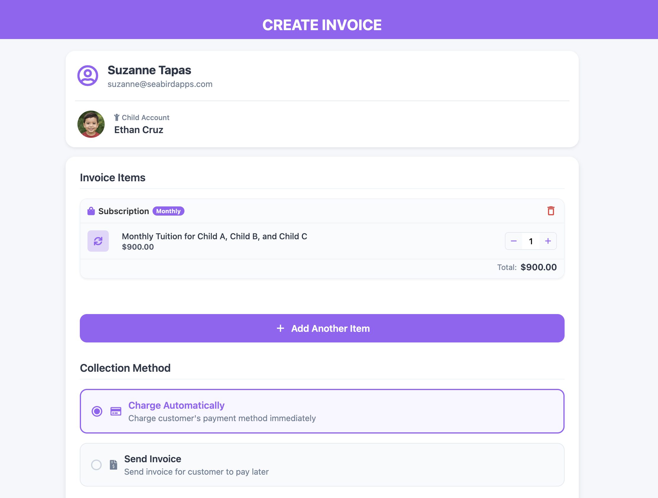 - Choose what you are billing for (e.g., Monthly Tuition).
