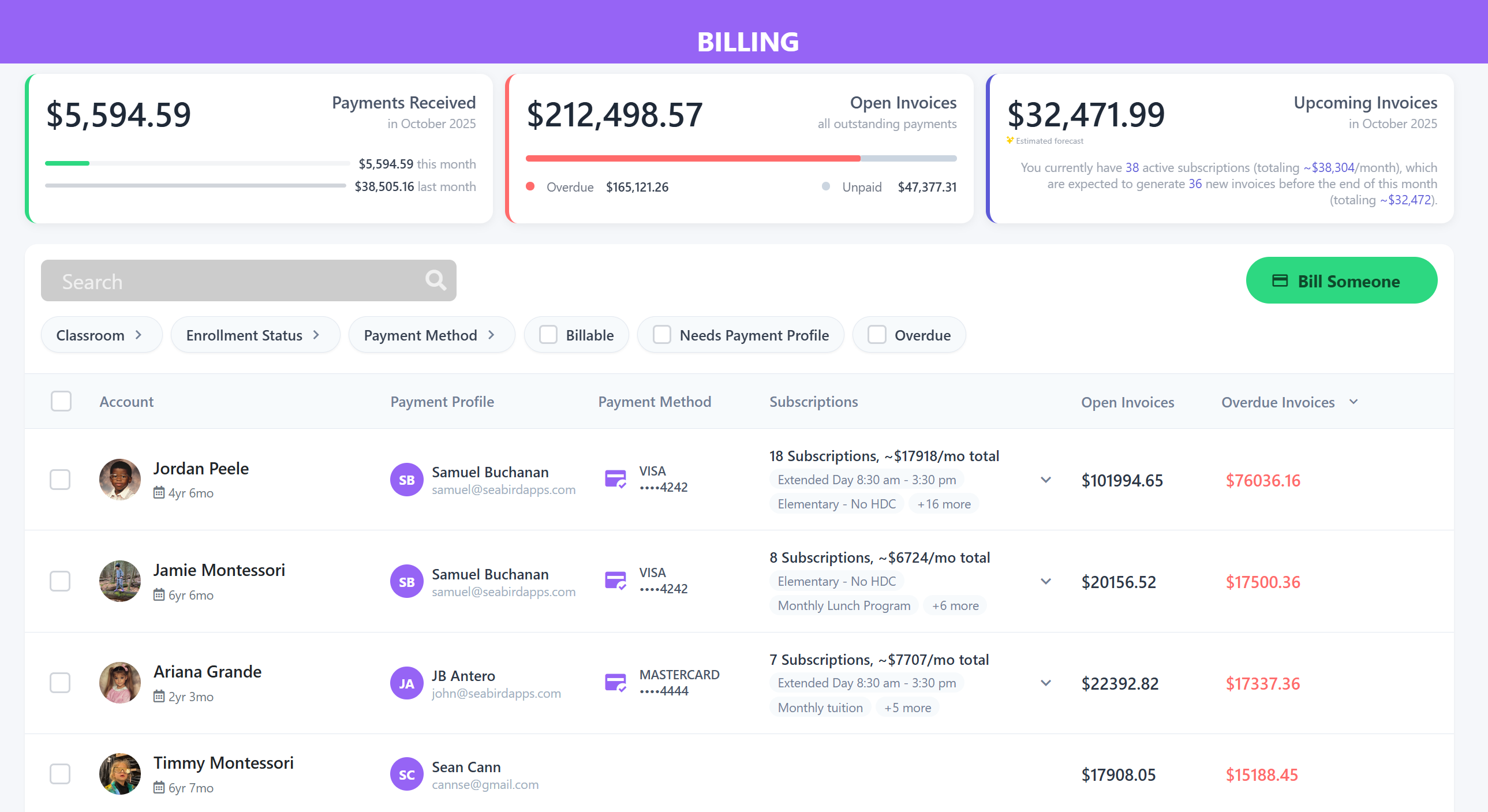 The Billing Dashboard in Onespot makes it easy to monitor all payments in one place. You can view total payments received, open invoices, overdue balances, and upcoming forecasted payments at a glance. Use the filters (like Billable, Overdue, or Needs Payment Profile) to quickly identify which families have outstanding invoices or missed payments. This helps administrators stay organized, follow up efficiently, and keep tuition collection on track.