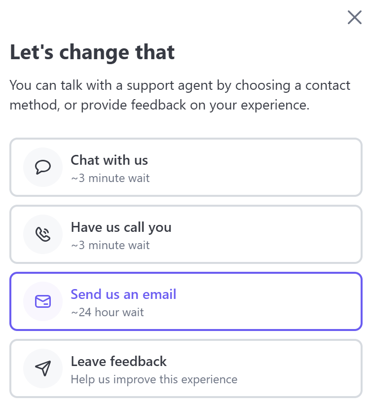 Important: You should select "Send Us An Email" instead of chatting with a rep. Email is faster, and they escalate it to the right team.
