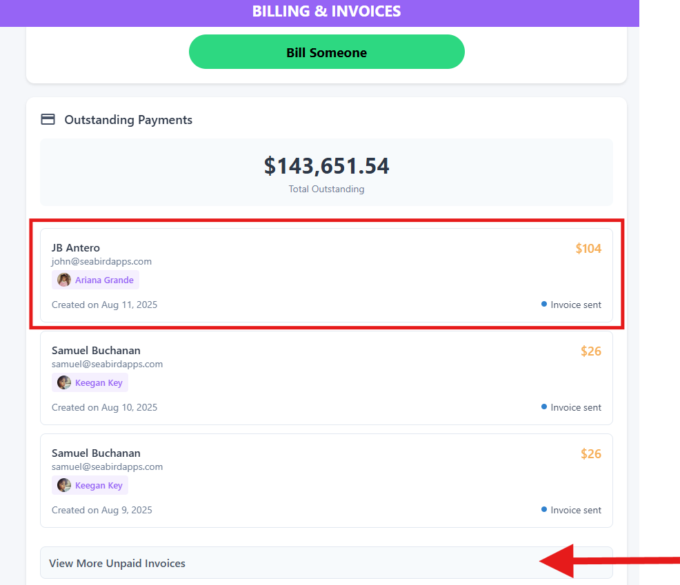 💡 Tip: Click View More Unpaid Invoices to see all unpaid invoices.