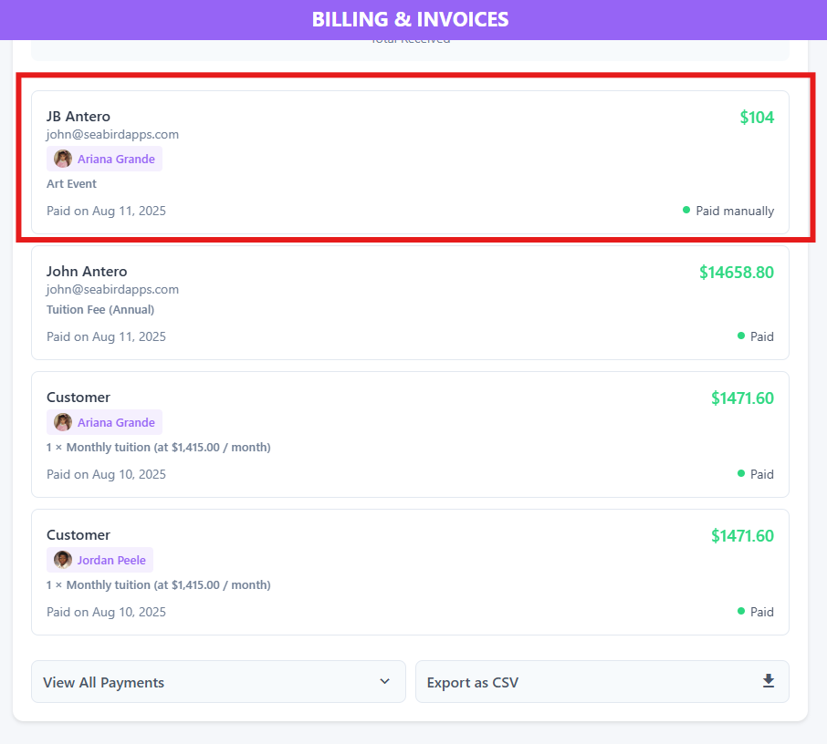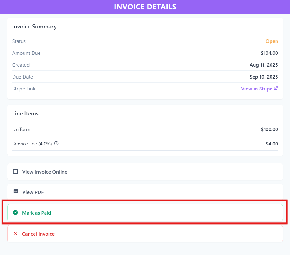 If a parent pays by cash, check, or any offline method, admins can manually mark an invoice as paid in Onespot. This ensures the payment record is updated and the outstanding balance is cleared in the system. 💵