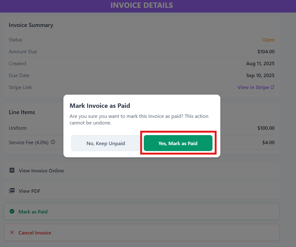 A confirmation pop-up will appear asking if you want to mark it as paid or keep it unpaid.