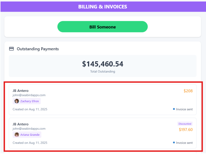 💵Under "Outstanding Payments", you can see the two pending invoices for the twins.