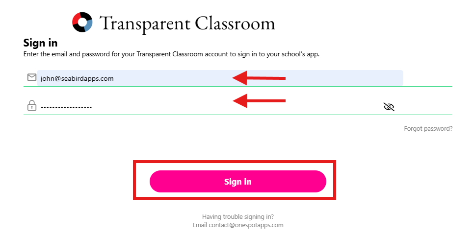 - Log in using your Transparent Classroom credentials.