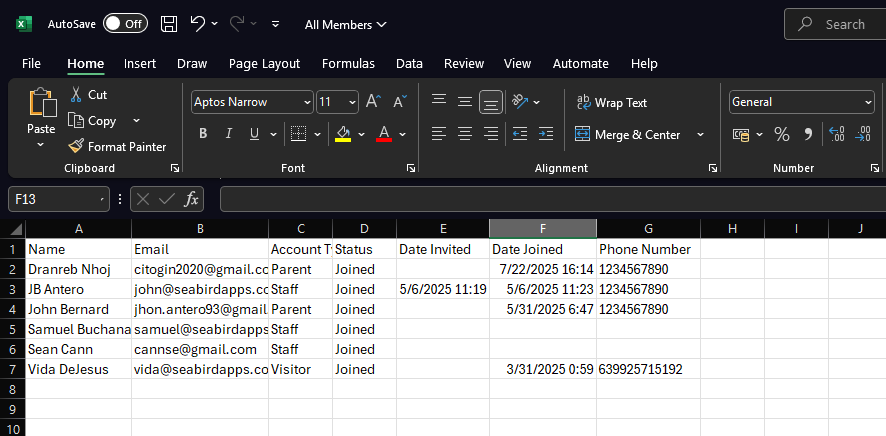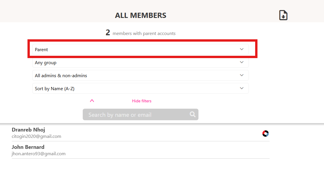 📁 Admins can easily export a list of all members who have signed up for the app, and even filter it by specific account type (e.g., Parents), so you only download the data you need to check. The exported file is in CSV format, which you can open in Excel, Google Sheets, or any spreadsheet software for record-keeping, reporting, or sharing.