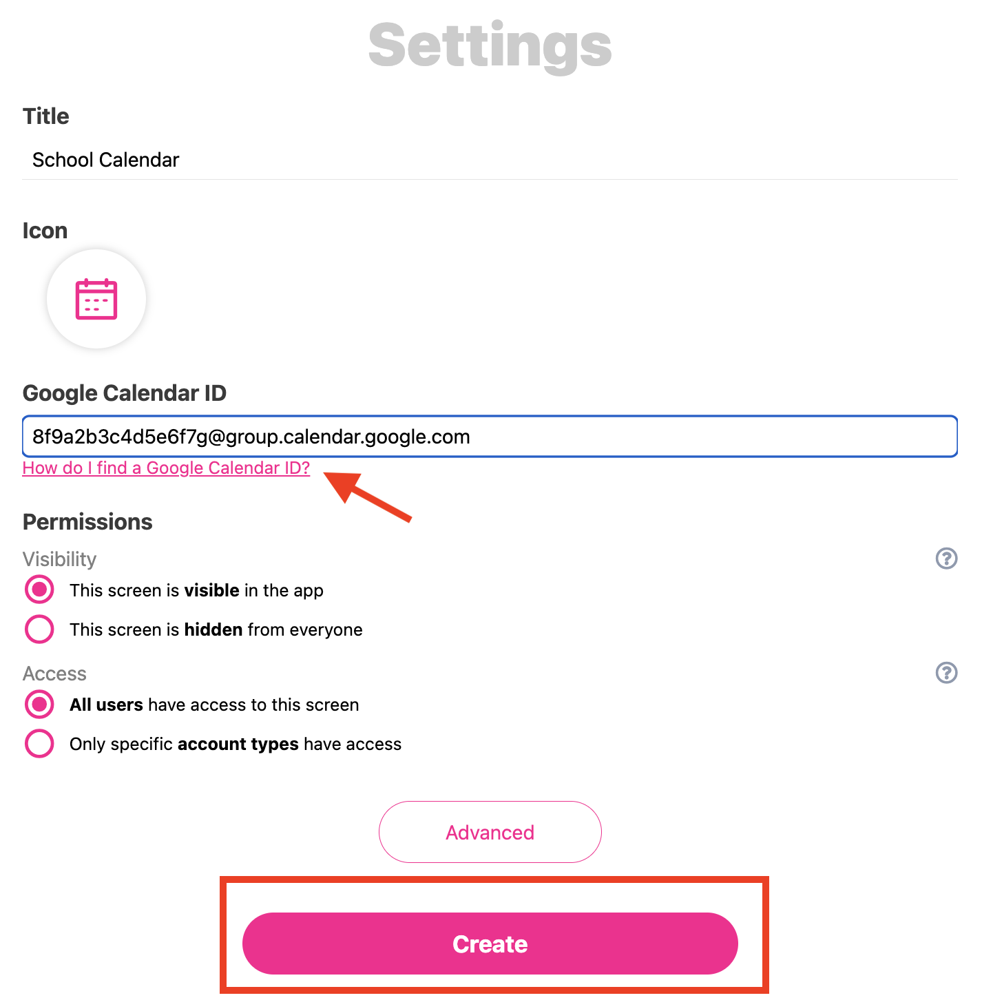 This step shows how to link your Events Calendar using your Google Calendar ID so events automatically sync and display inside your app.
