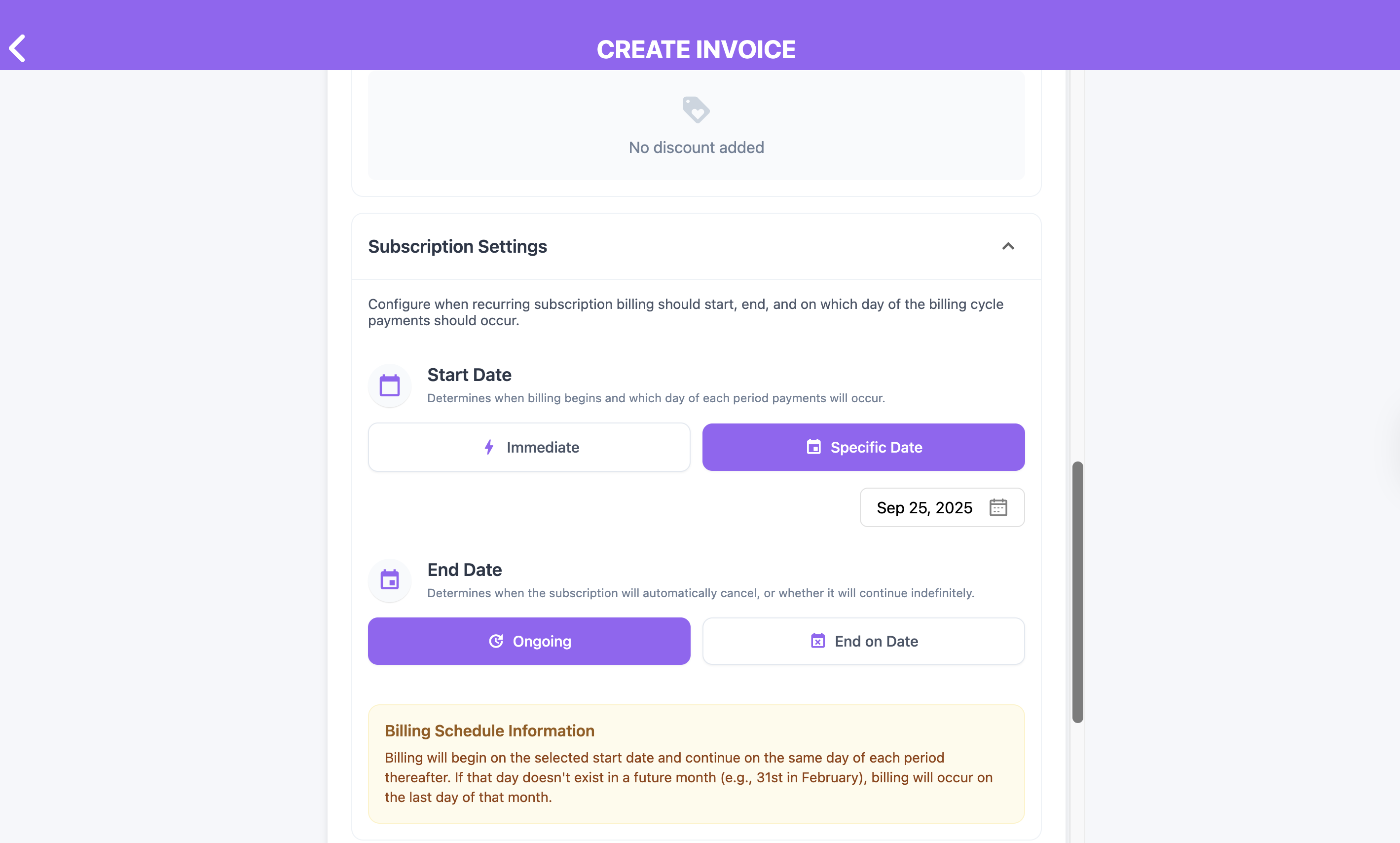 - Set the billing to start on a specific date (e.g., September 25th), and set the end date to ongoing to ensure it is recurring every nth of the month