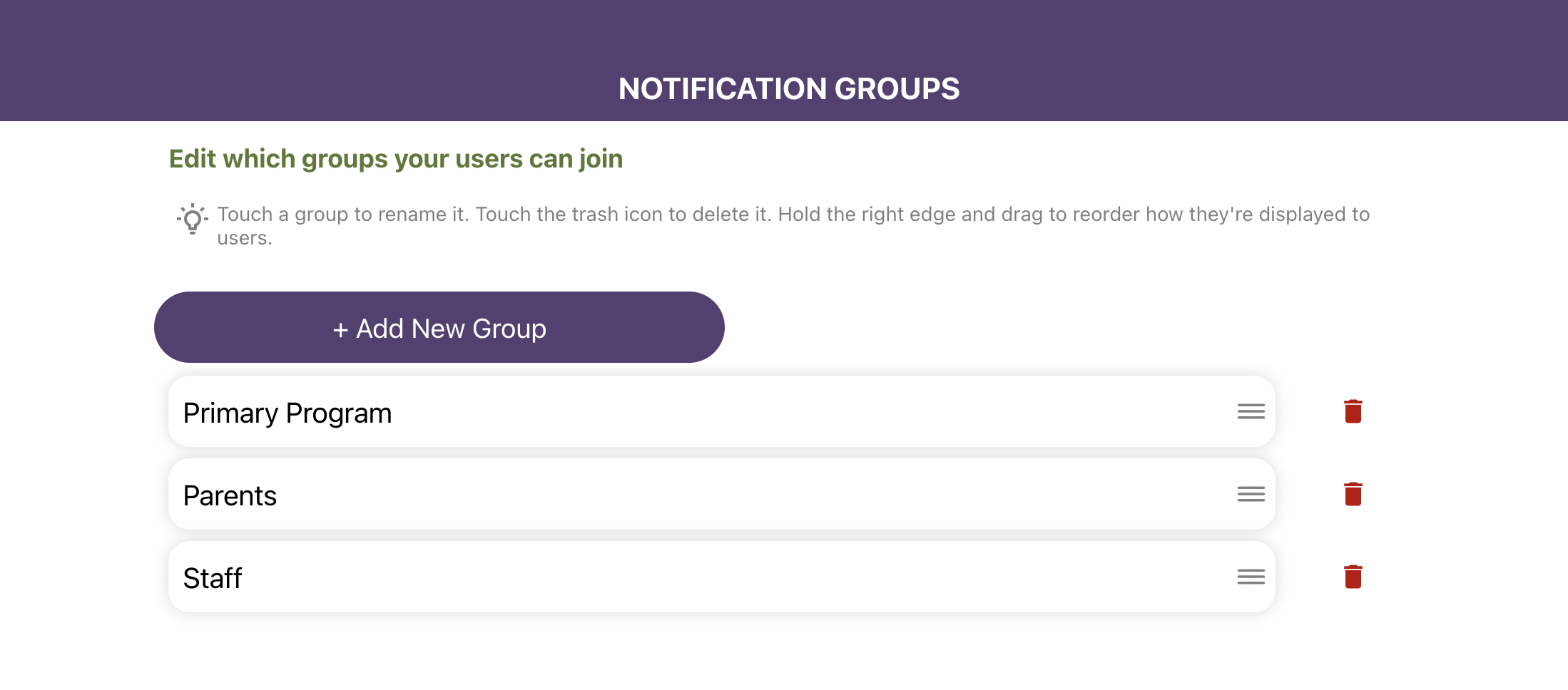 Notification Groups are your way of sending the right message to the right people. Right after a new user first joins your app, they’re asked to select which groups they belong to. These choices determine which notifications they’ll receive going forward.