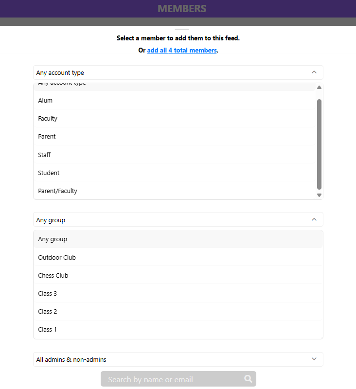 π Tip: You can also add members during the initial creation of the Activity Feed screen, saving time if you already know which members should be included.