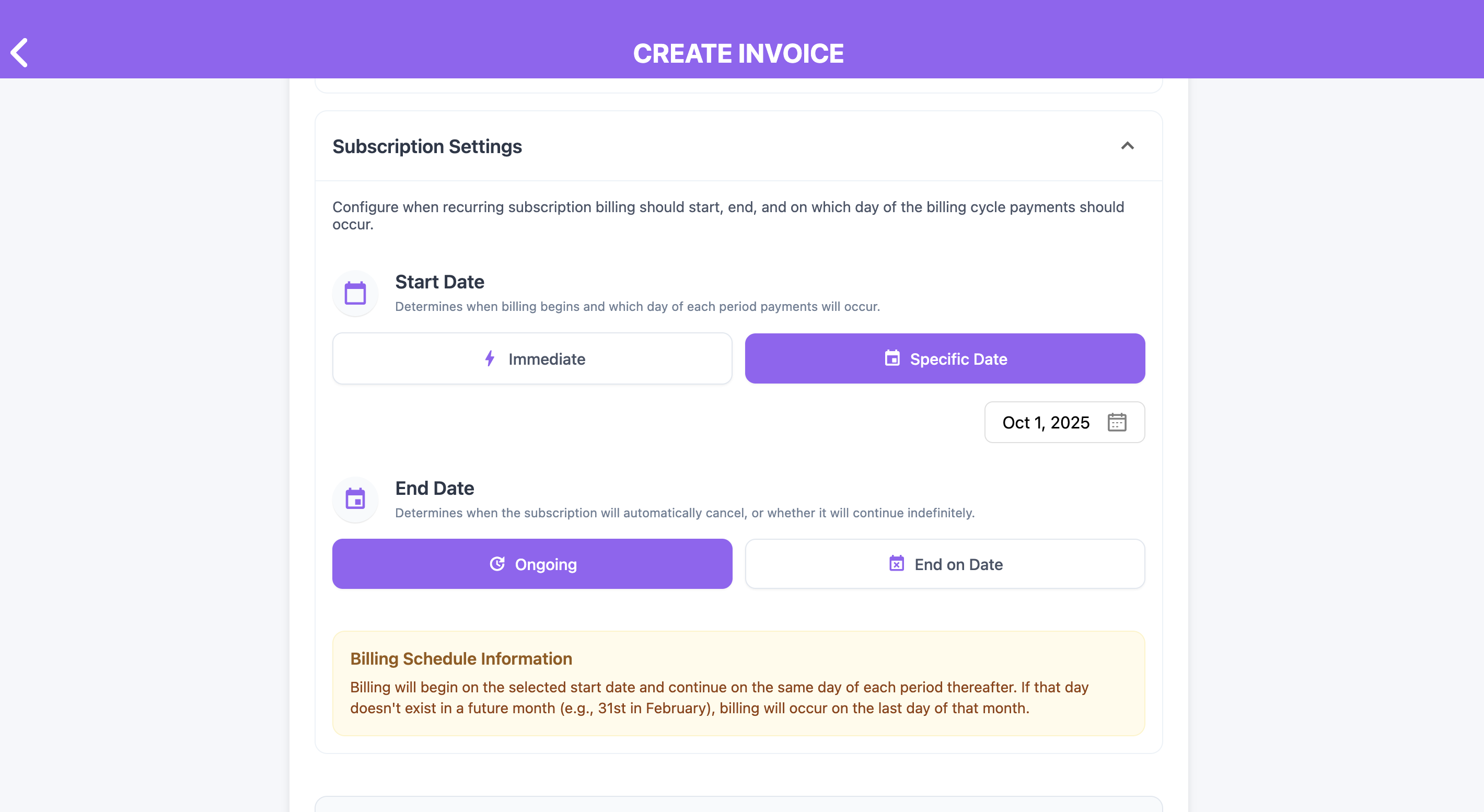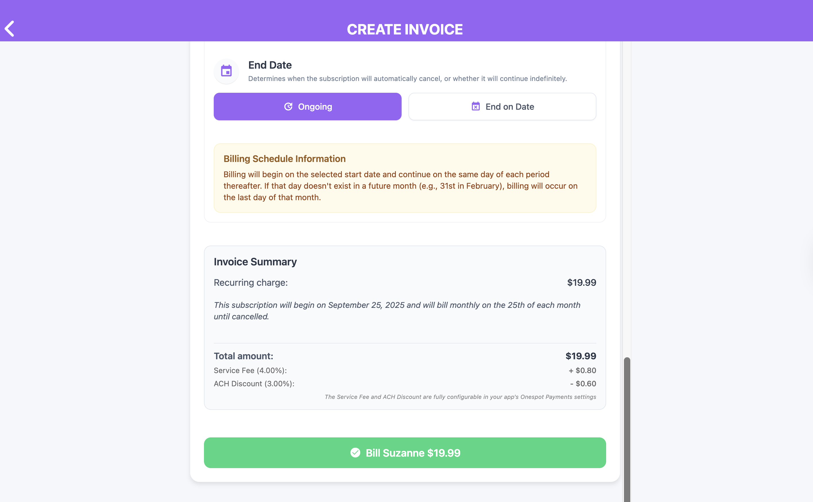 - Set the End Date to Ongoing to ensure the invoice recurs each month.