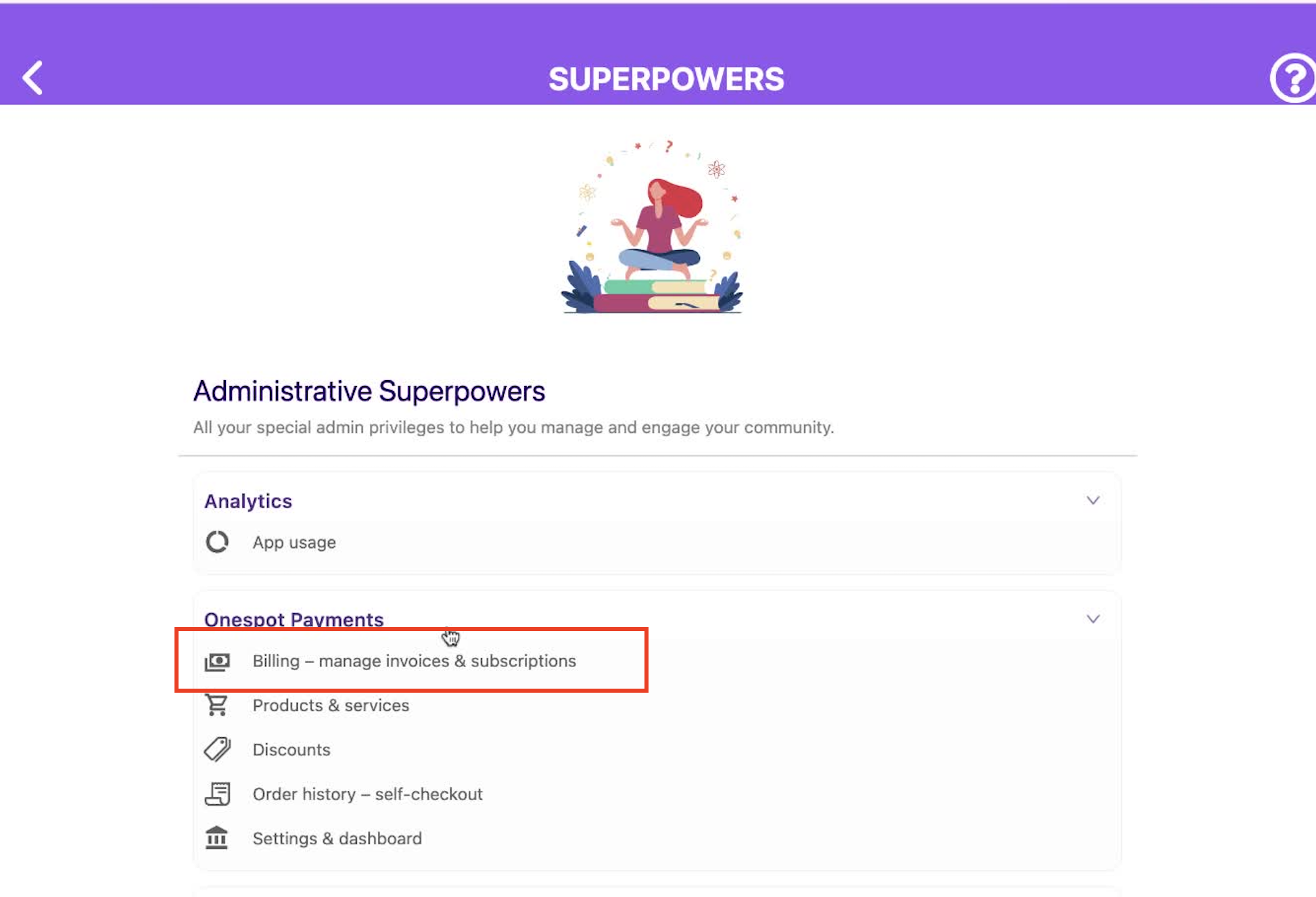 - In your Administrative Superpowers ⚡, go to the Billing - manage invoices and subscriptions.