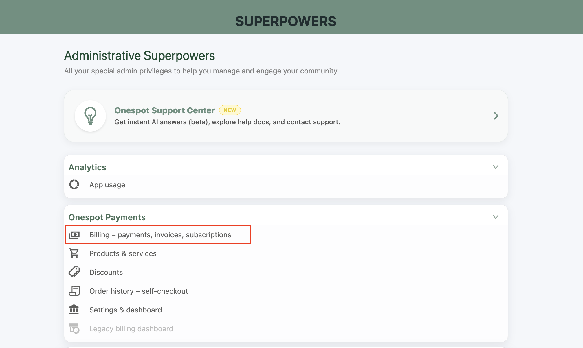 - In your Administrative Superpowers โก, go to the Billing - payments, invoices, subscriptions.