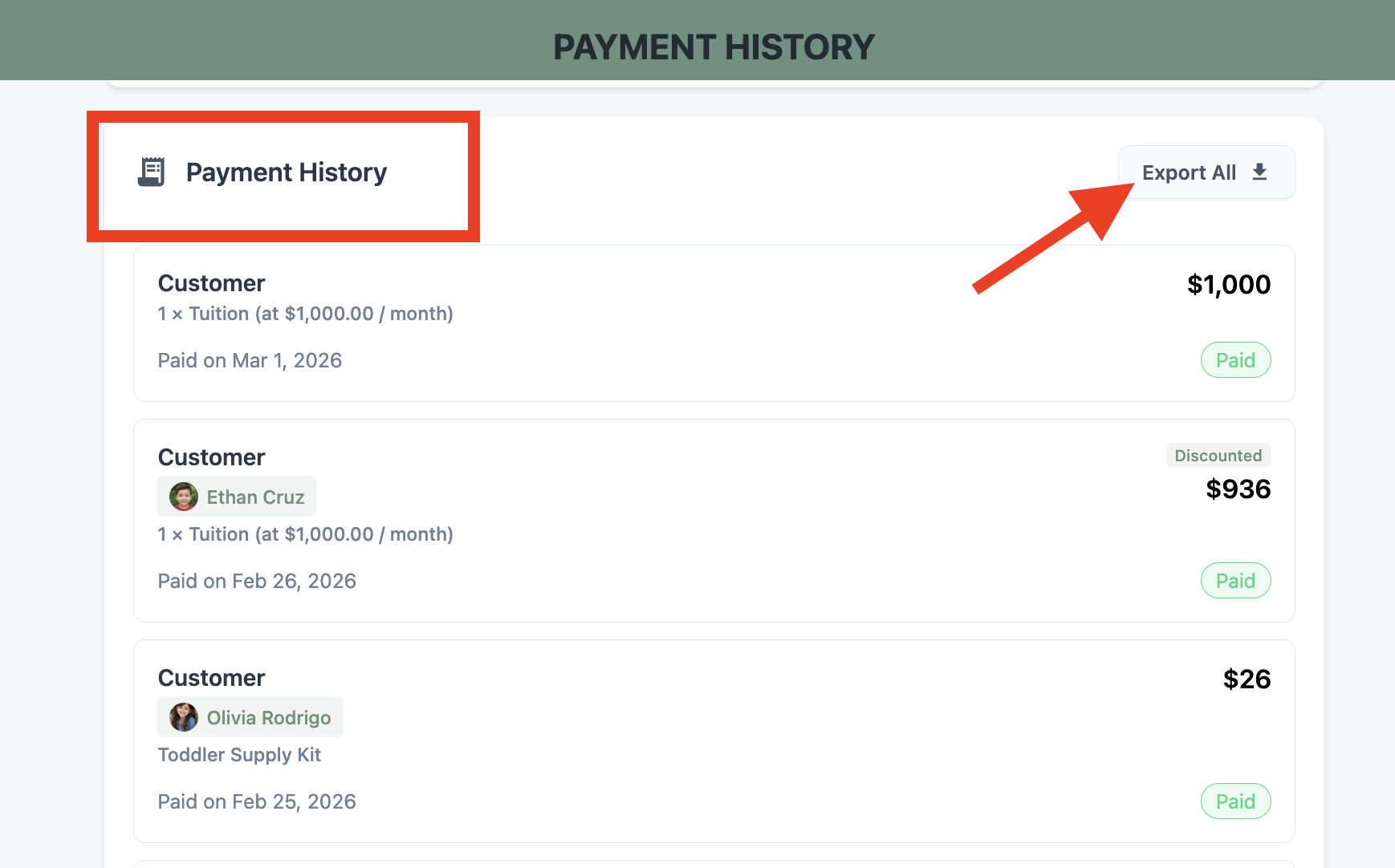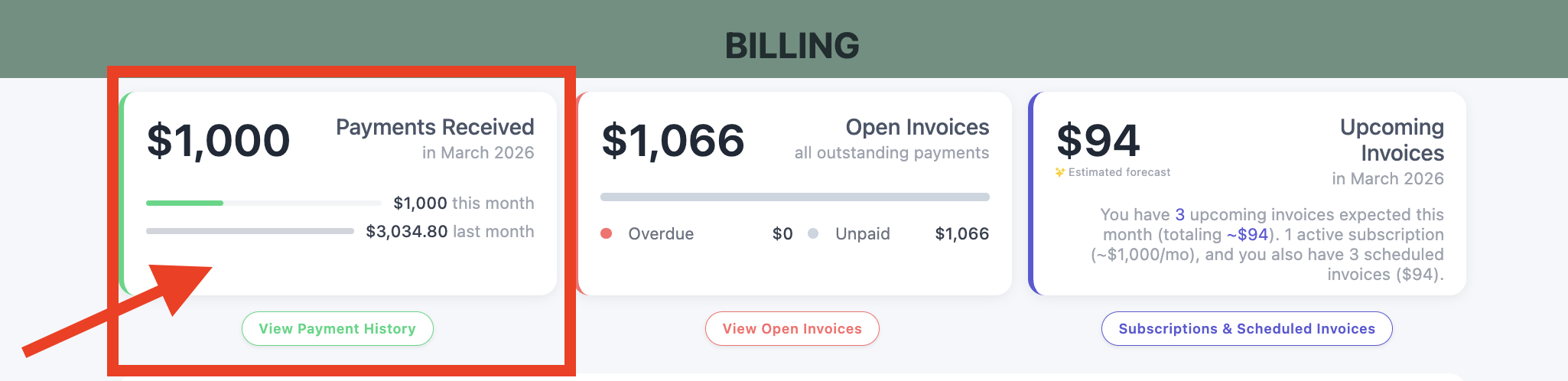 - In the Billing dashboard, click View Payment History (under the โPayments Receivedโ card)