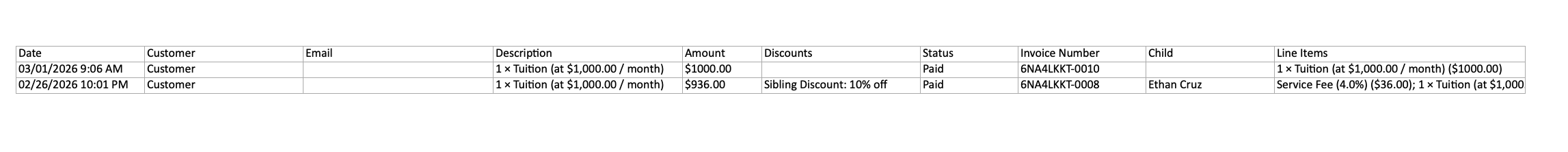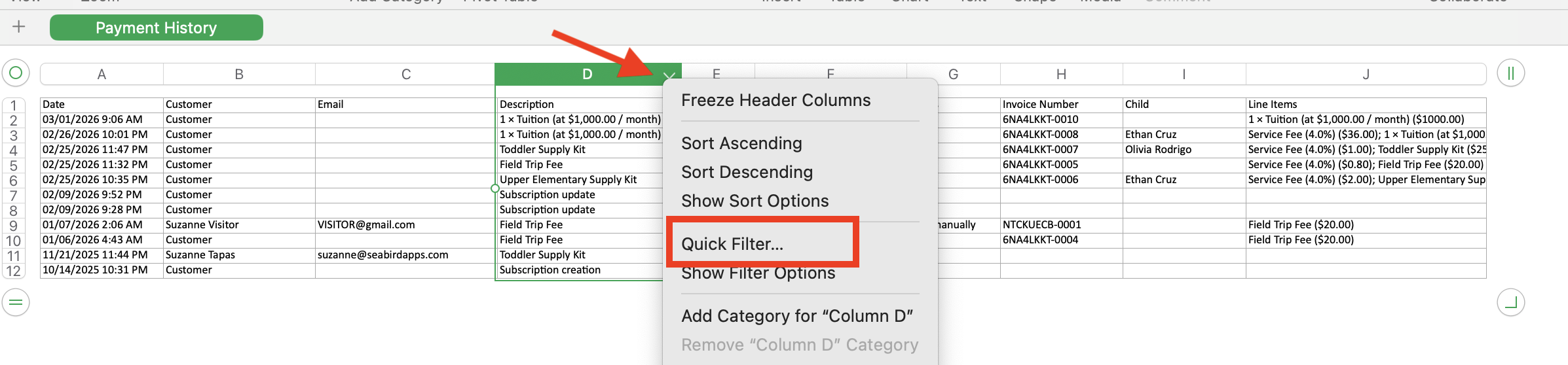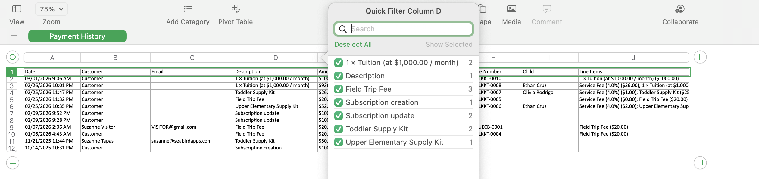- Once exported, your payment history will download as an Excel (.xlsx) file. Open the file to immediately view, sort, and edit your data as needed.