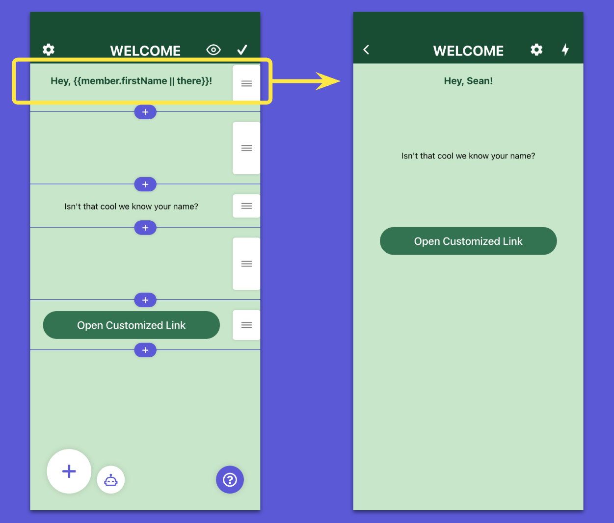 In Preview mode, the app will show the member’s own name or information in place of the variable.