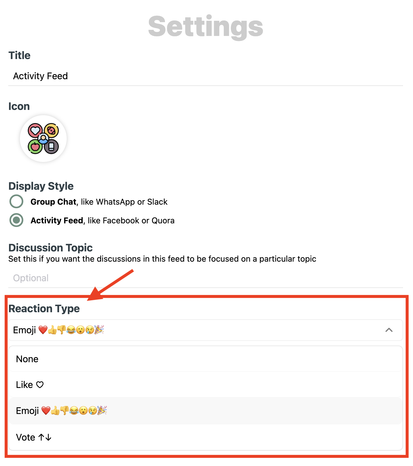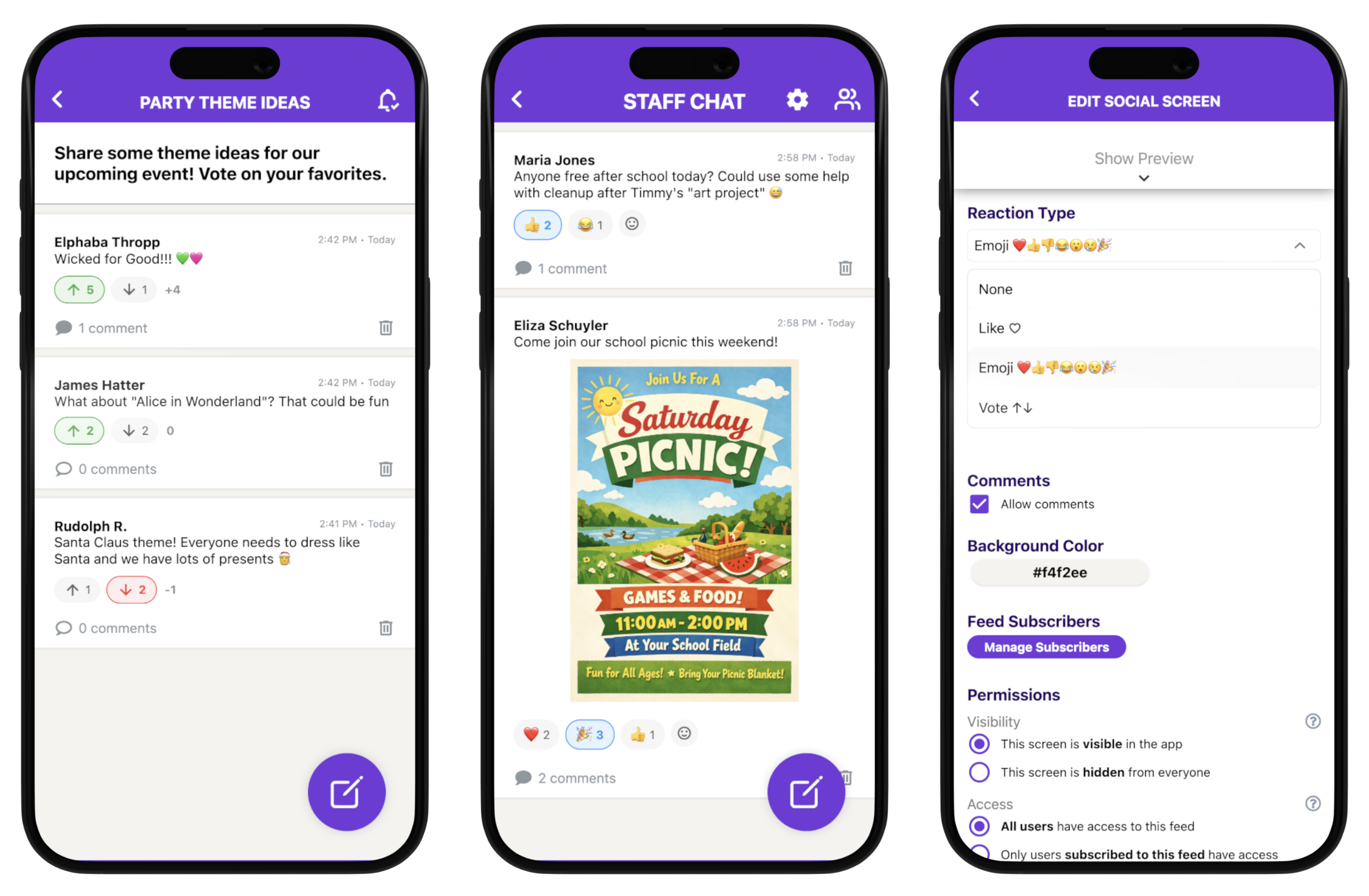 Group chats and activity feeds support multiple reaction types, giving schools more flexible and meaningful ways to engage families and staff. Instead of only using a basic “Like,” you can now enable Emoji reactions or Vote (Upvote/Downvote) reactions.