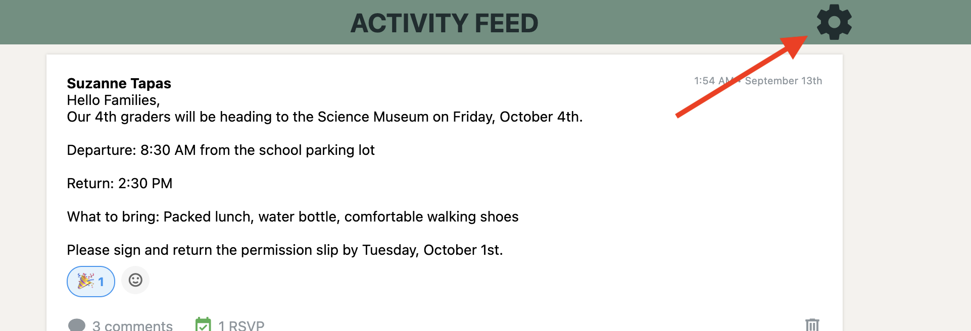 Open the Group Chat or Activity Feed you want to edit, then click the gear icon (⚙️) in the top-right corner to open the settings.