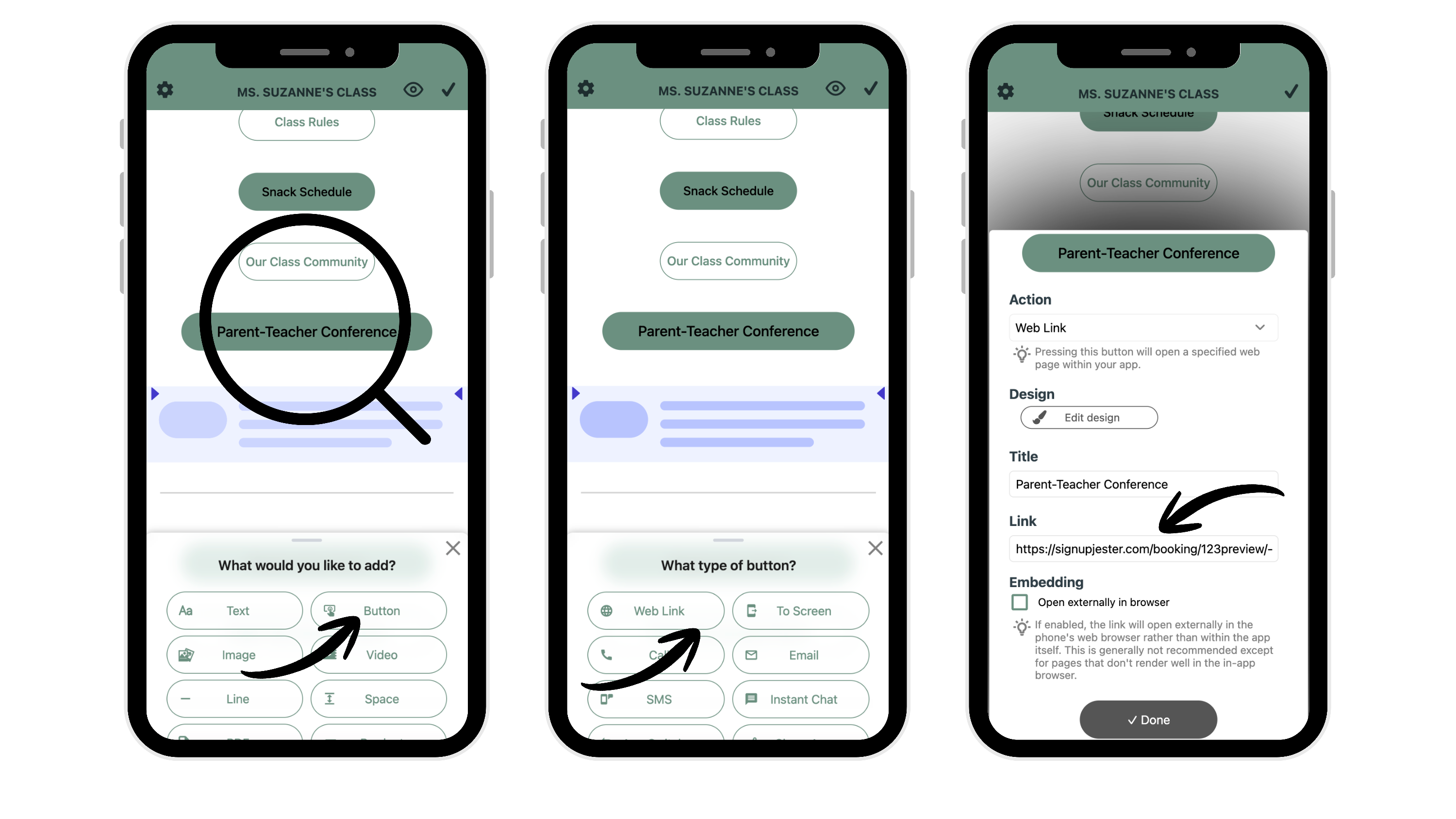 Once your SignUpJester sign-up is created, you can add it to your Classroom screen using a button- web link. This makes it easy for families to sign up directly from the app with one tap.