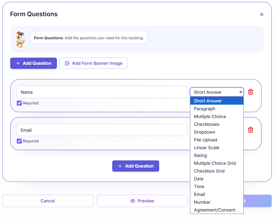 - Short Answer, Paragraph, Multiple Choice, Checkboxes, Dropdown