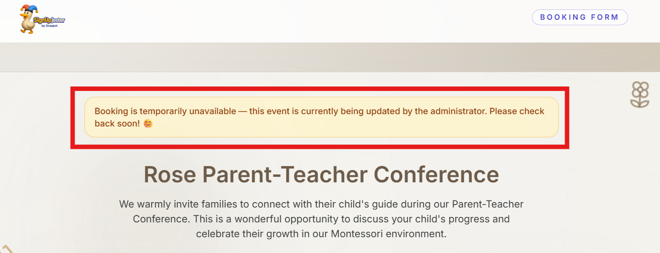 - The live booking form locks automatically once an admin clicks Edit, preventing participants from booking while changes are in progress.