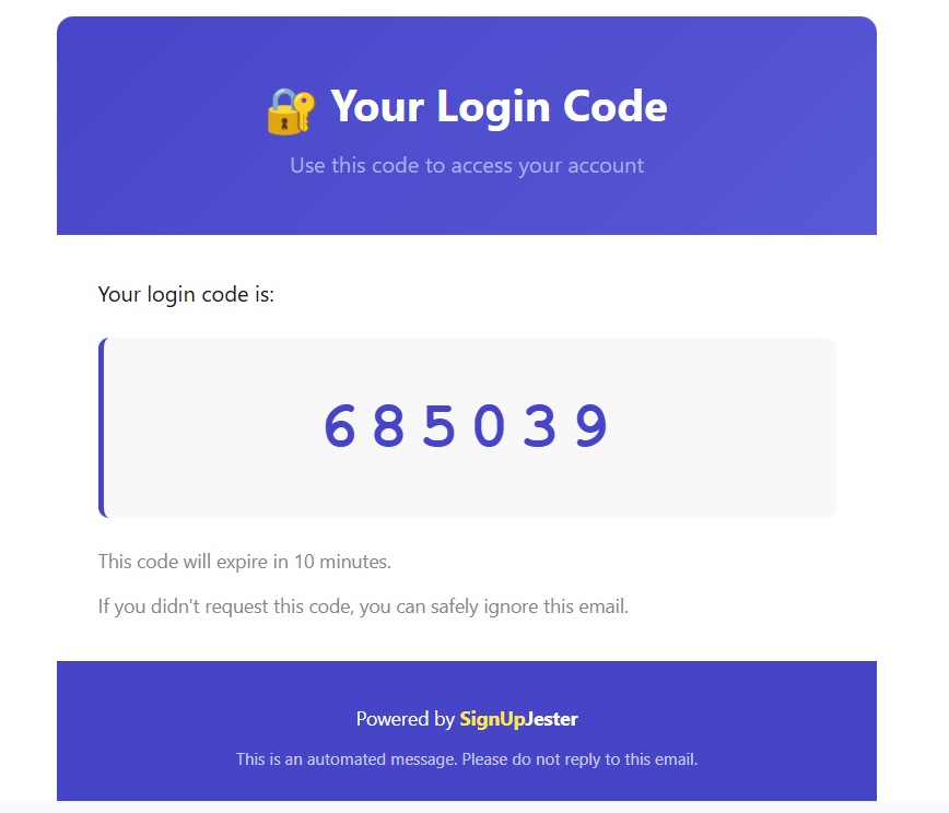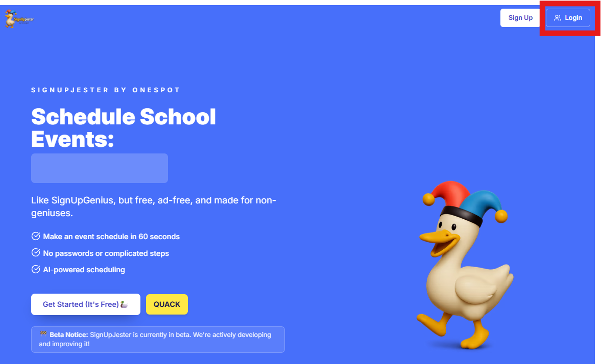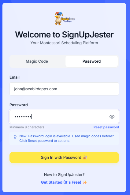 Logging in to SignUpJester is simple and flexible. You can choose to log in using a Magic Code sent to your email or with a Password if youโve set one up.