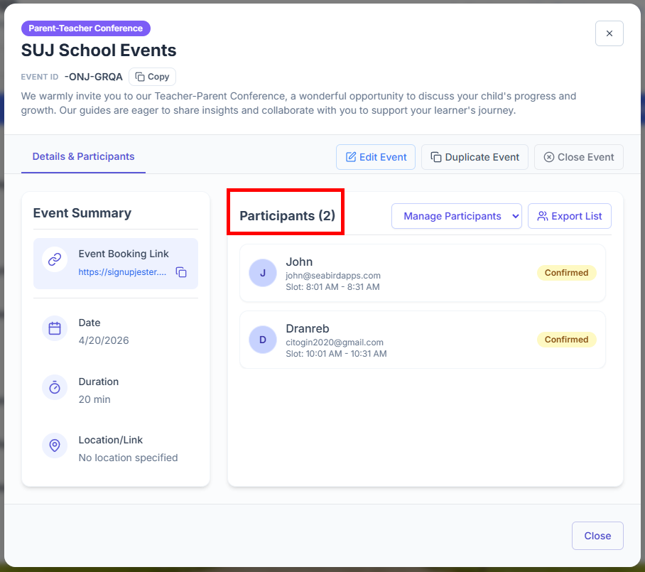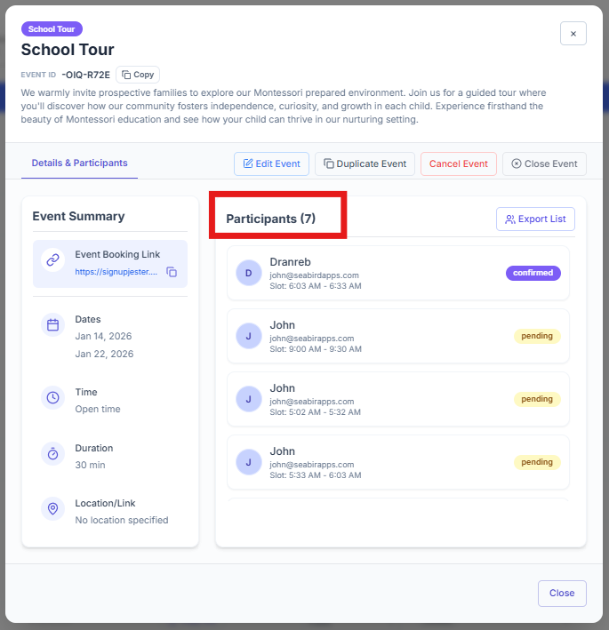 Want to see who signed up for your event? SignUpJester makes it easy for admins to check participant lists directly from the dashboard or even from the booking link. No more guessing whoโs coming; everything is organized and just a click away!