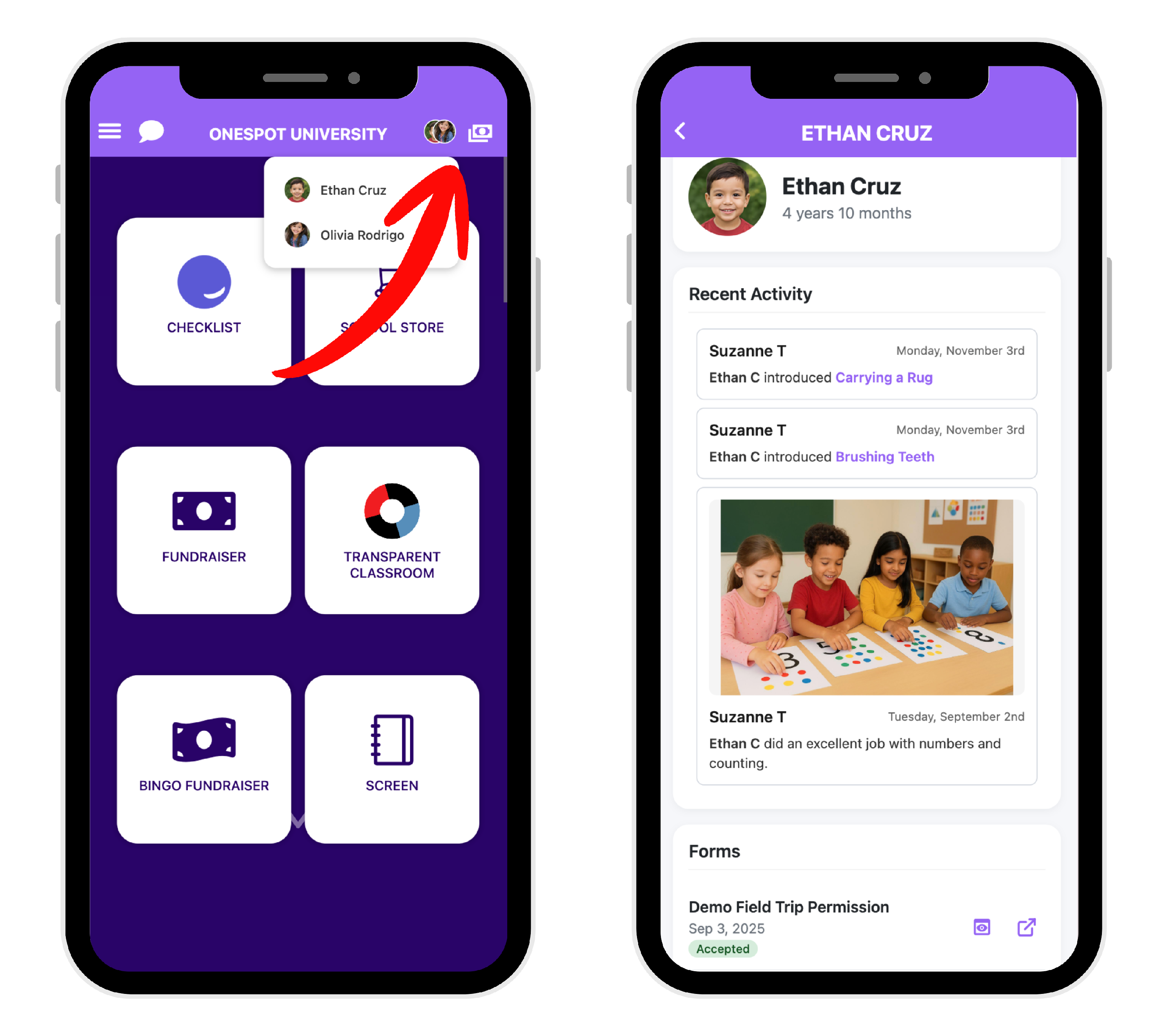 The Transparent Classroom + Onespot dashboard is the TC-connected dashboard that families see inside the Onespot app.