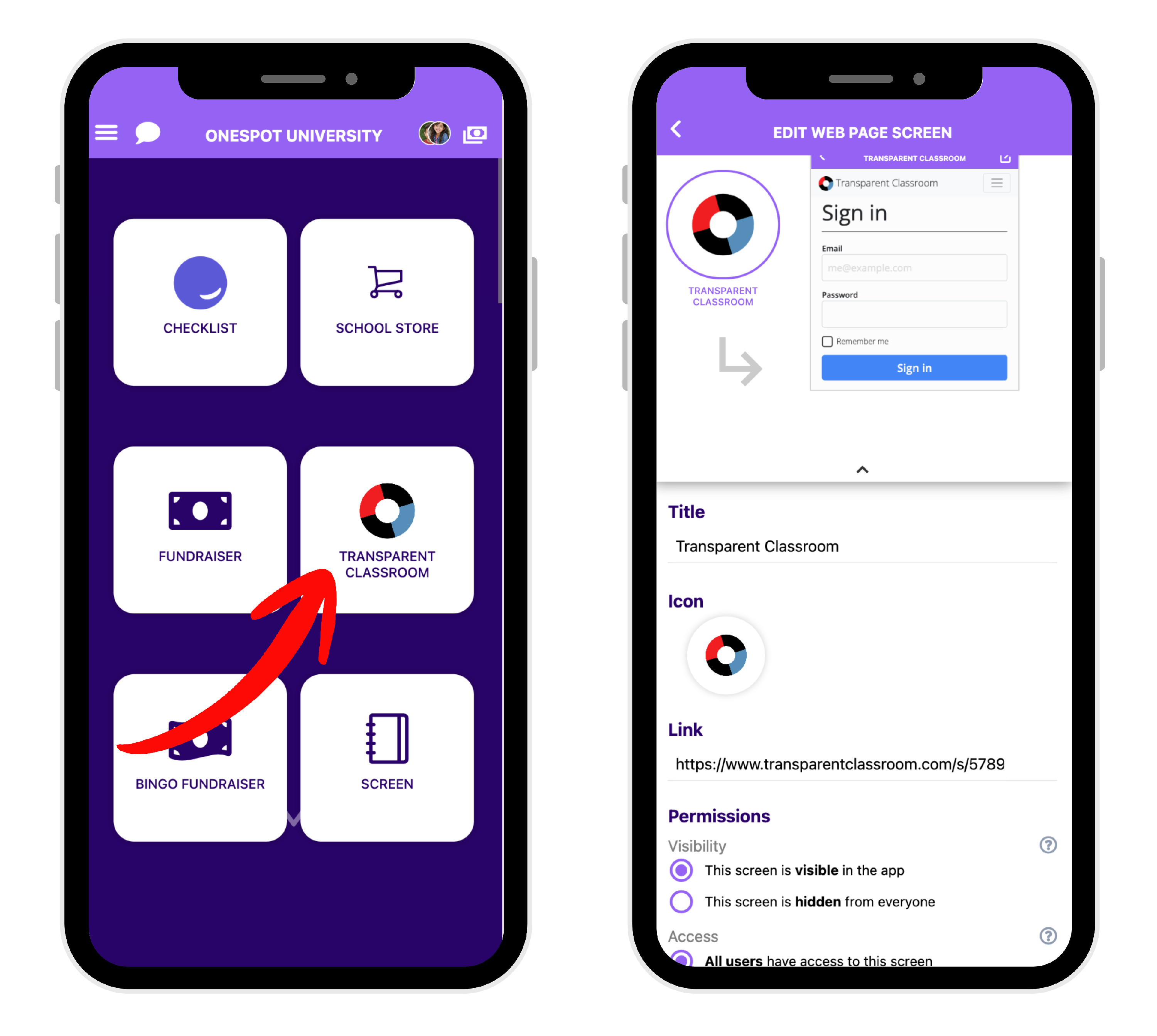When you tap the Transparent Classroom screen inside Onespot, you are opening an embedded version of Transparent Classroomโs web portal.