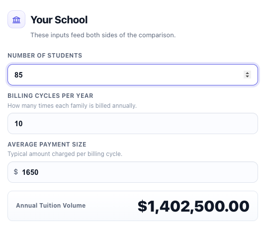 The calculator provides estimates only and should not be considered financial advice. Actual results may vary depending on how families choose to pay. For more information on payments and processing, you can also reference Stripeโs official website.