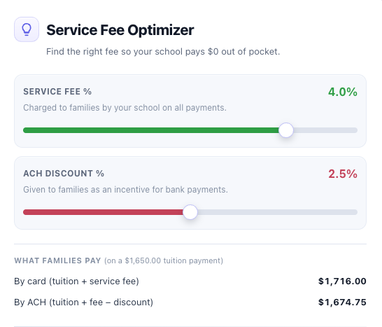 By adjusting a few inputs, schools can see how different scenarios may affect their tuition revenue and determine whether they want to absorb payment fees or pass some of them to parents through a service fee.