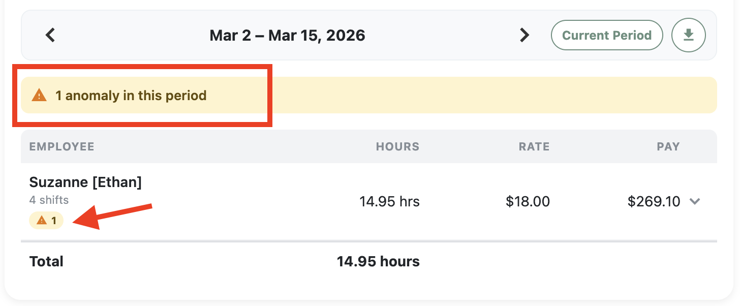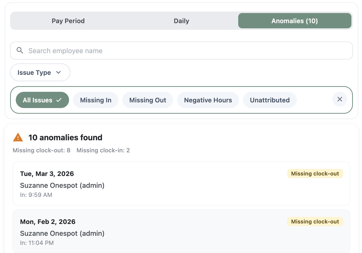 - Anomalies highlights entries that may need attention, such as missing clock-outs