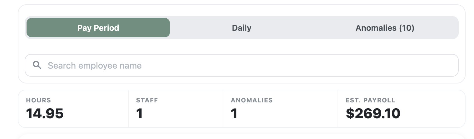 It groups employee time records into one selected pay period and gives you a quick summary of hours, staff count, anomalies, and estimated payroll.
