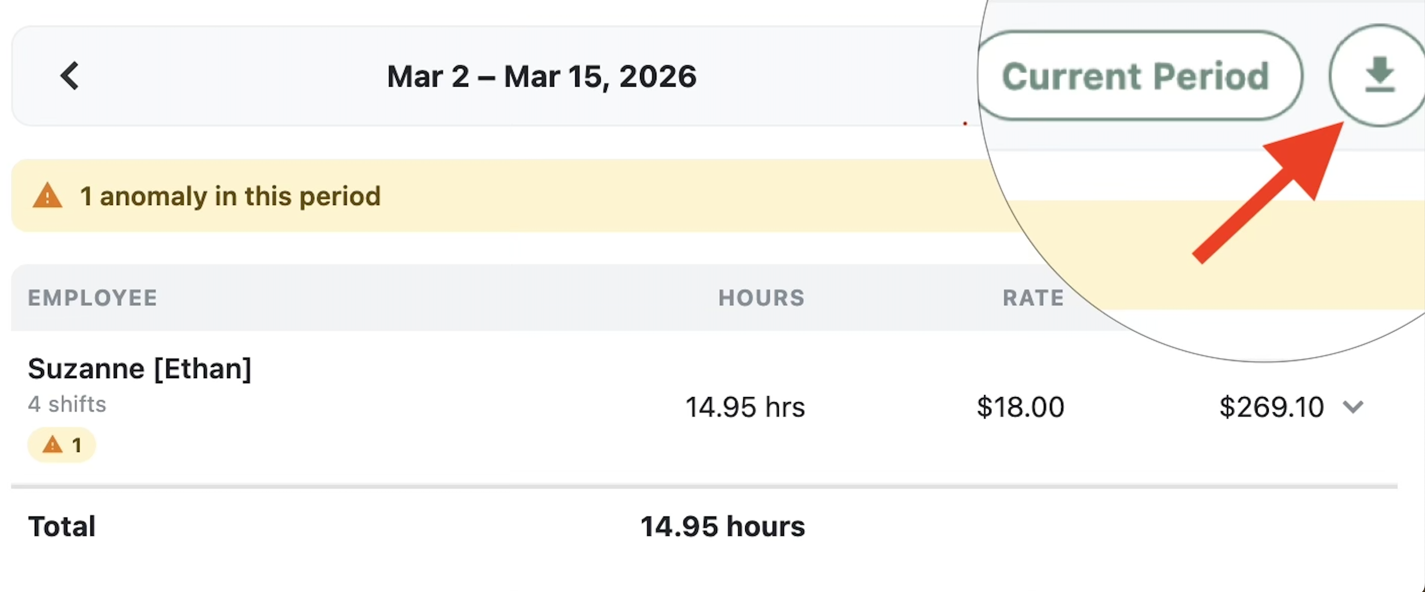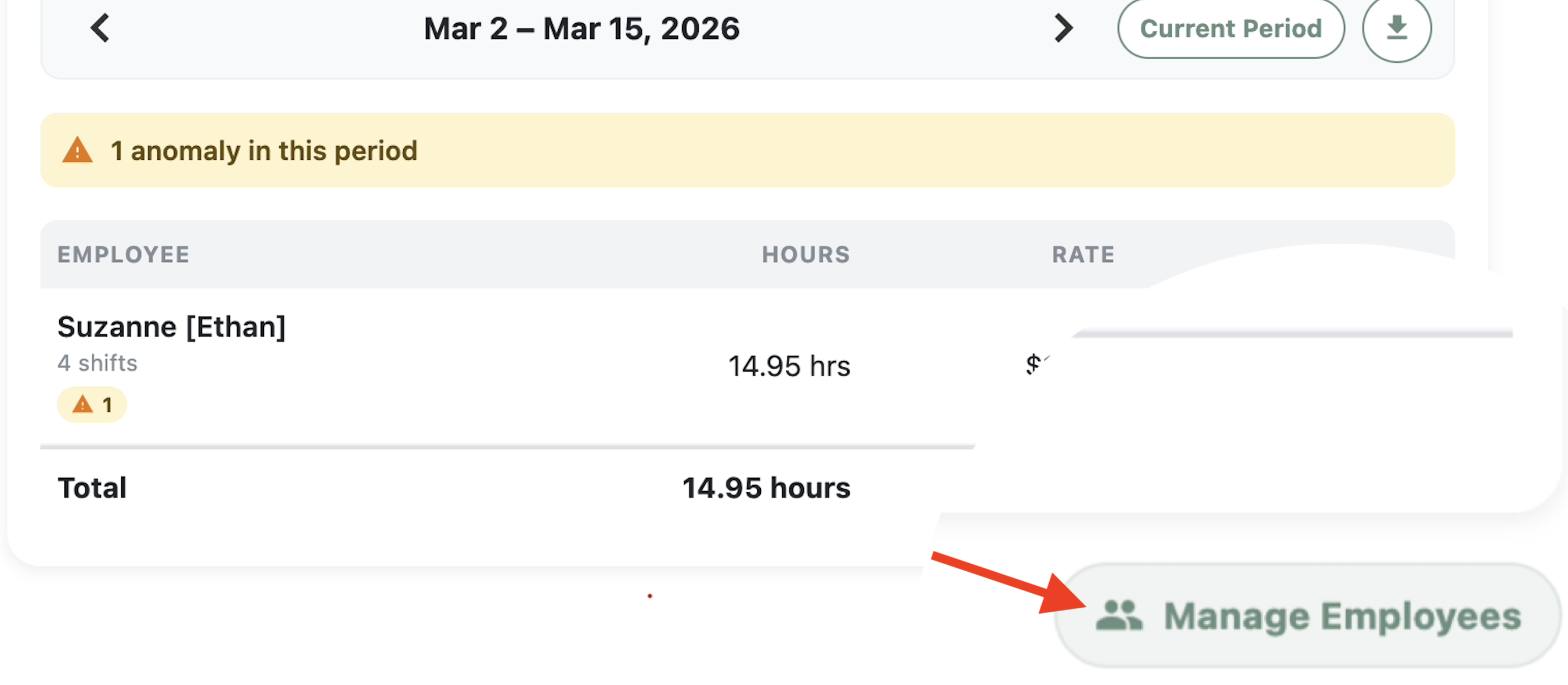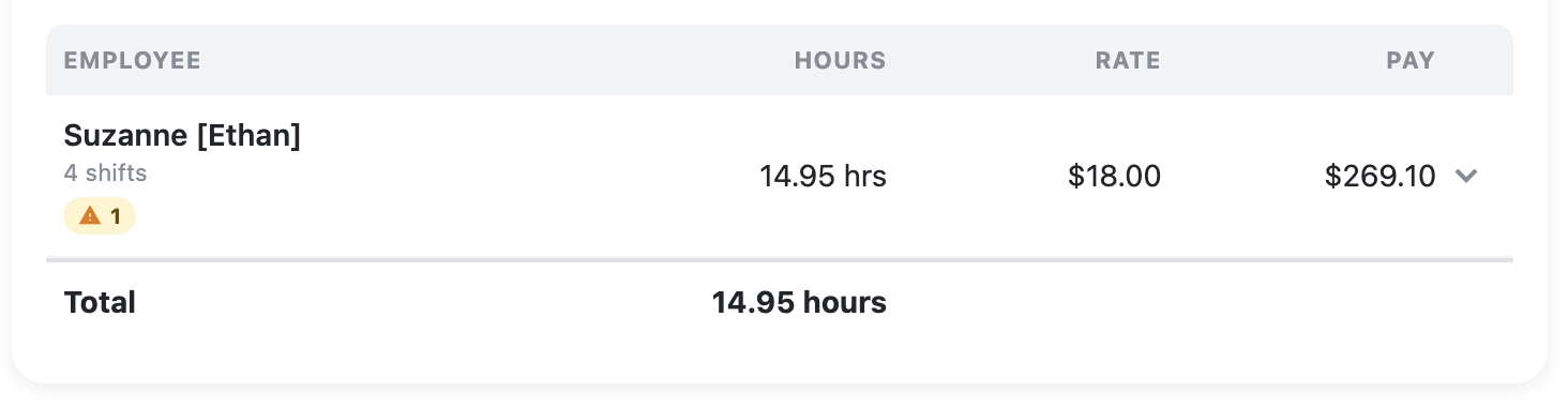 Here you can check each employeeโs hours, rate, pay, and shifts.