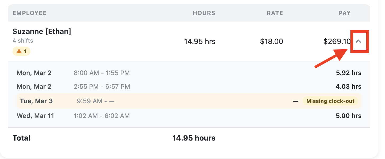 Click the dropdown arrow on an employee row to view that employeeโs recorded shifts.