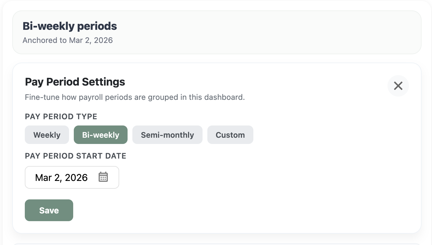 Once saved, the dashboard will regroup hours based on the new pay period settings.