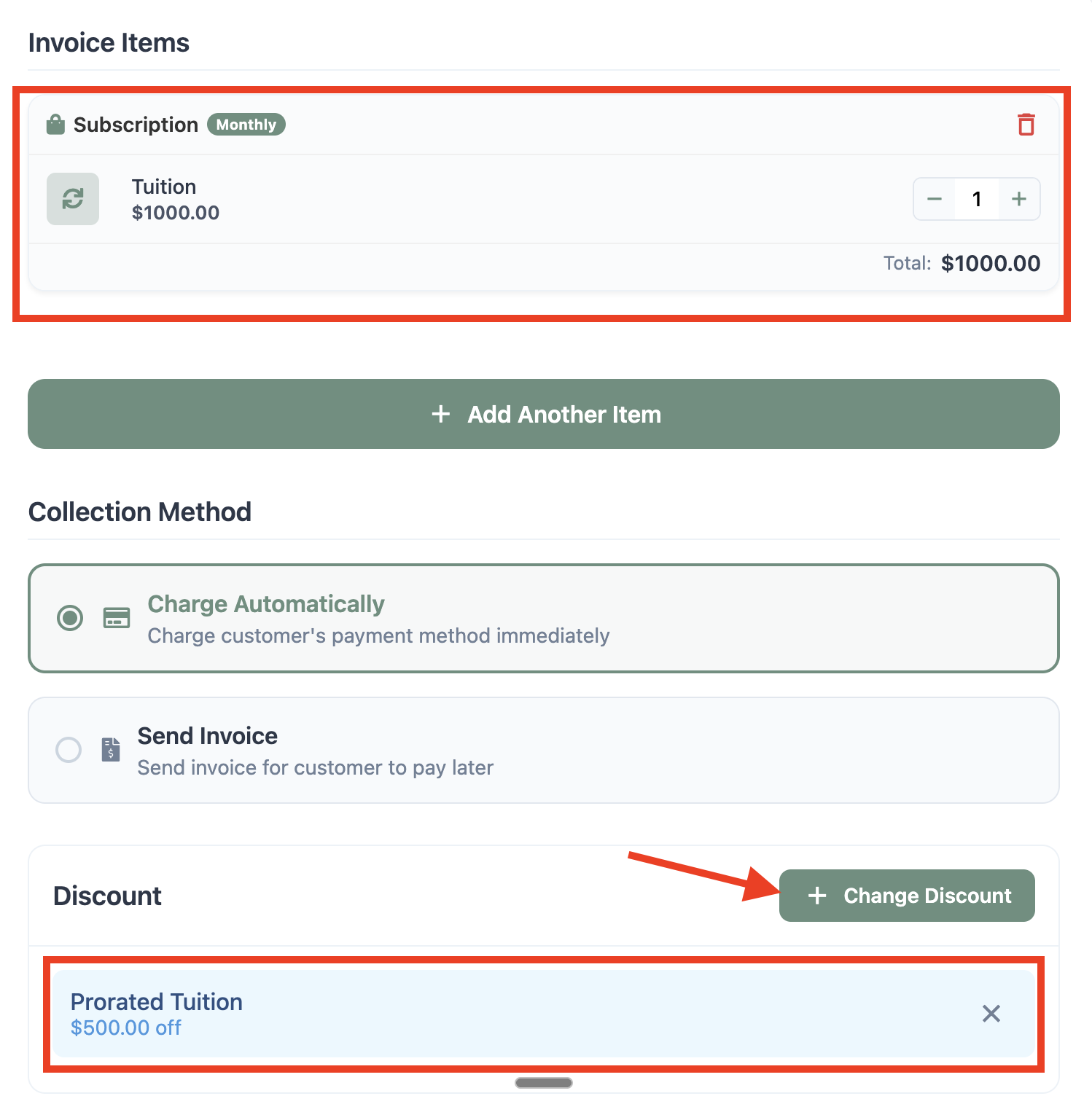 This will reduce the first invoice by the prorated amount, while all future subscription invoices will charge the full tuition amount.