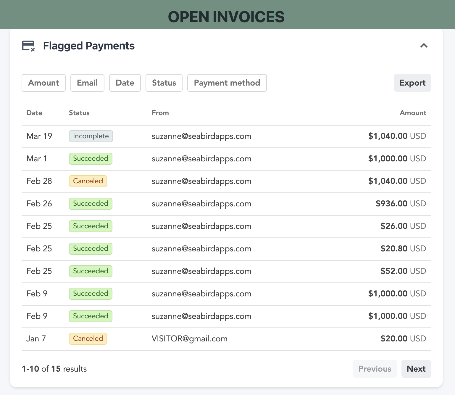 - Filter by amount, email, date, status, or payment method
