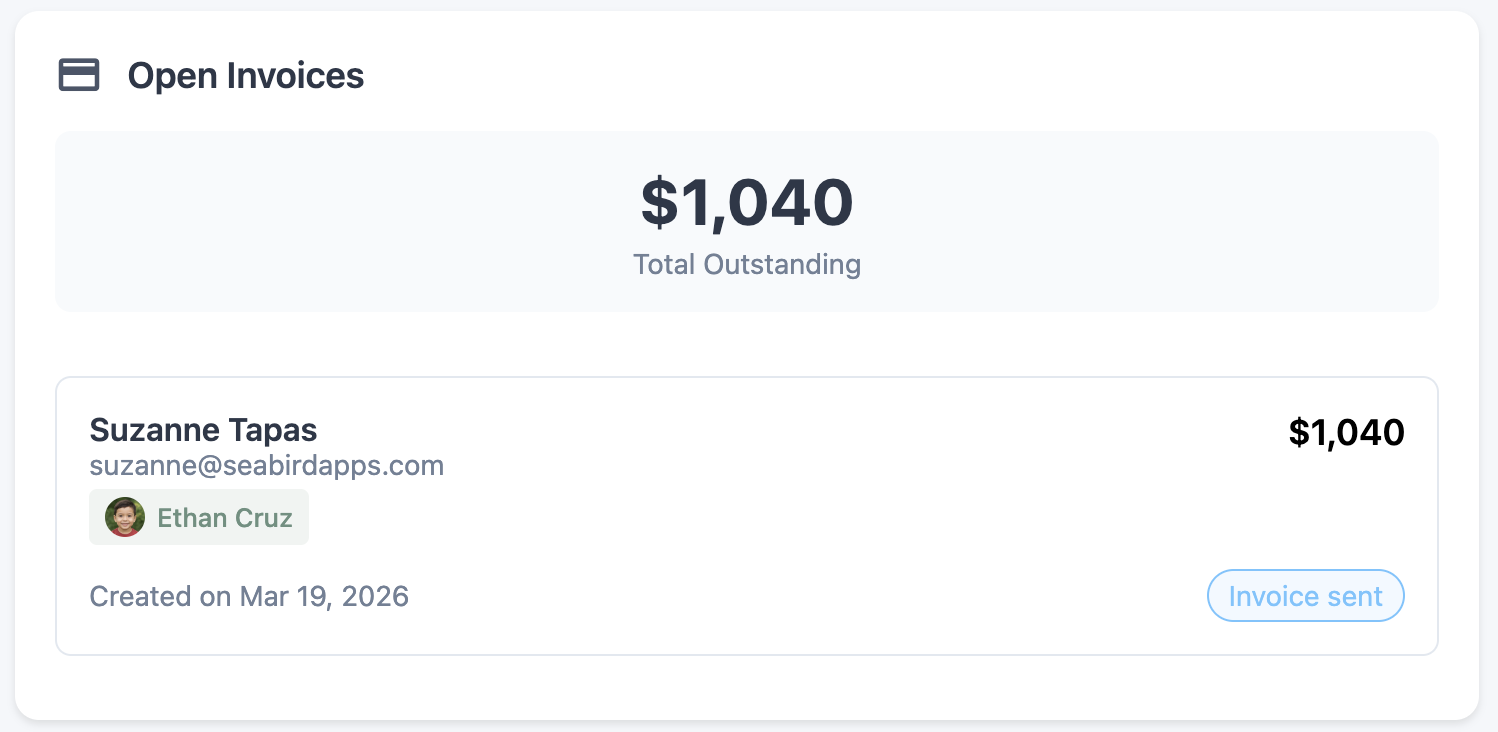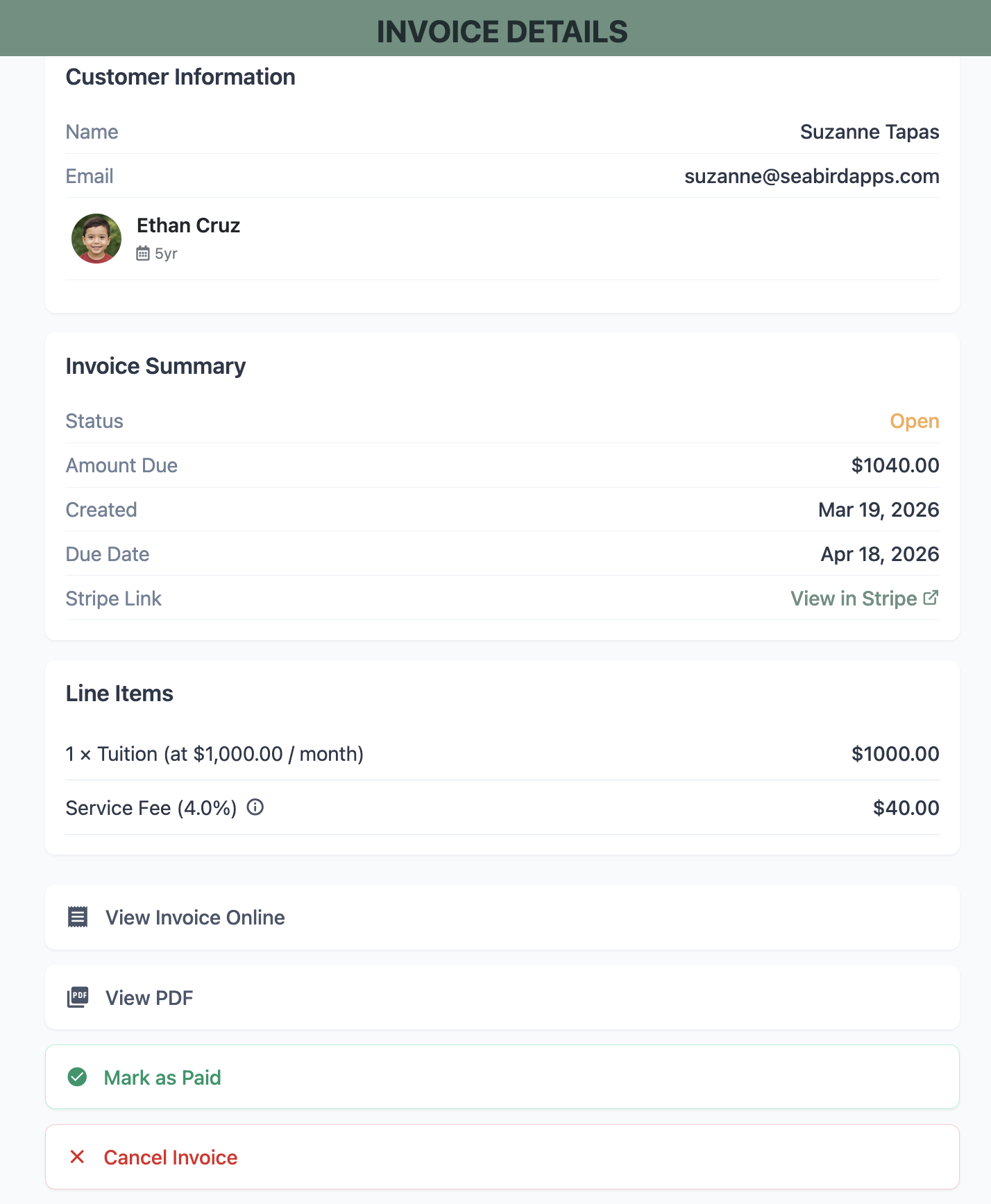 If you created an invoice for a parent, you can go to the Open Invoices section to check its status, view details, mark it as paid, or cancel it.