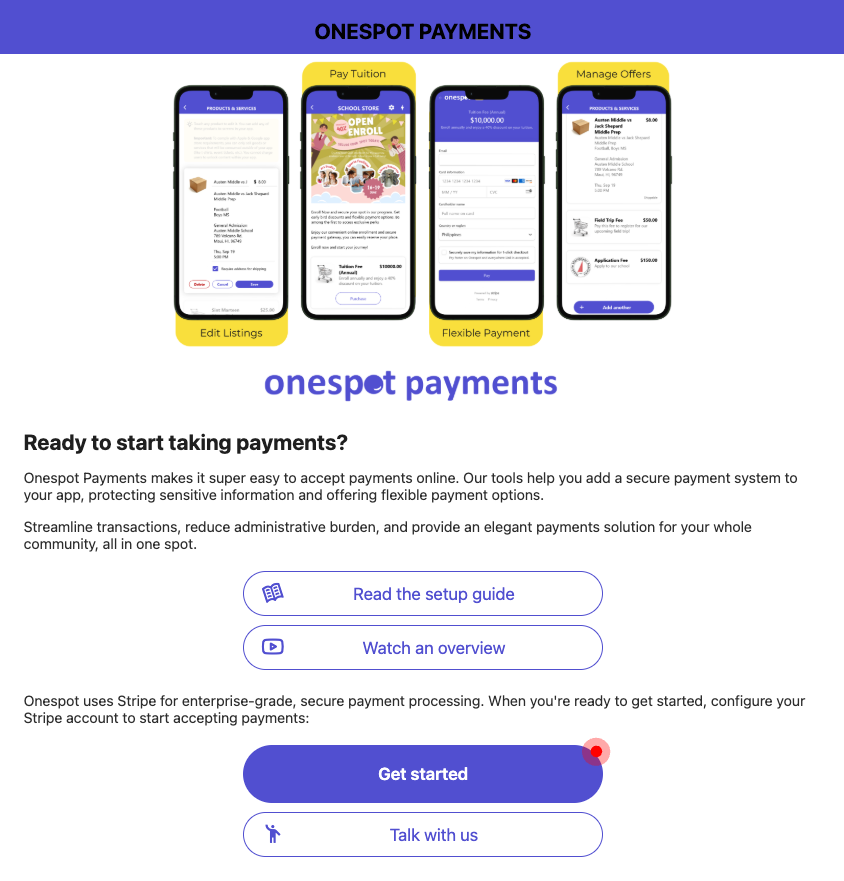 If Onespot Payments is enabled in your app, you can start accepting payments for school-related purchases, event fees, and donations seamlessly. Onespot integrates with Stripe, a secure payment processing platform, ensuring that transactions are fast and reliable.